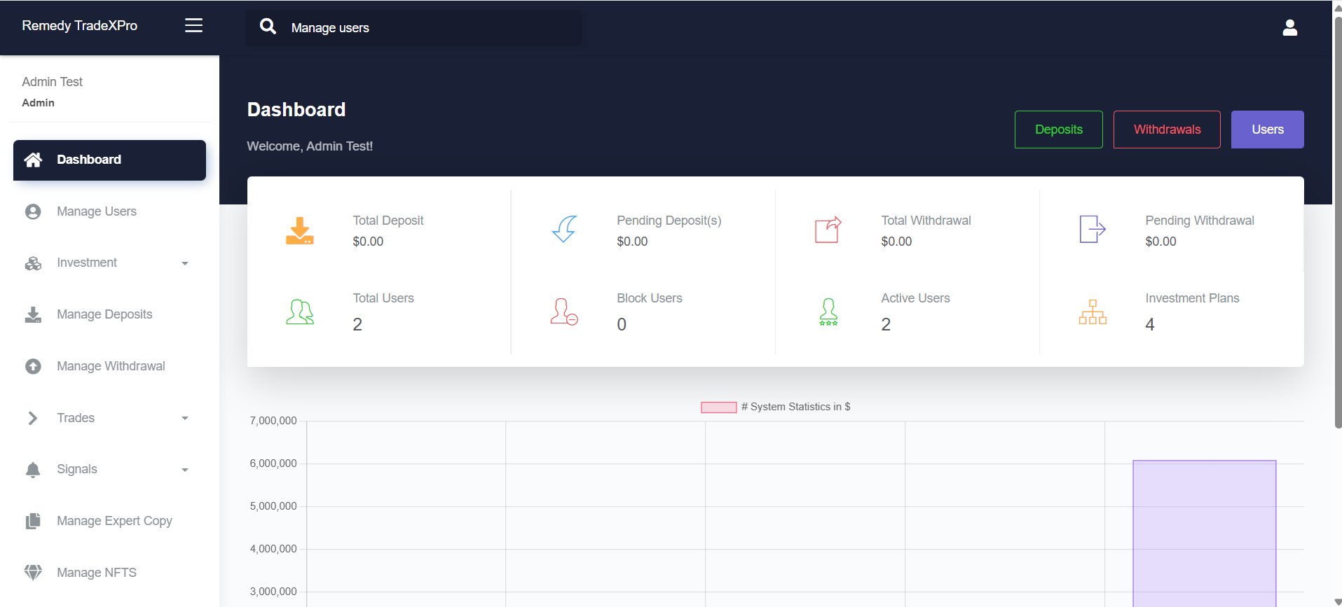 - Deposits & withdrawals (admin approval).